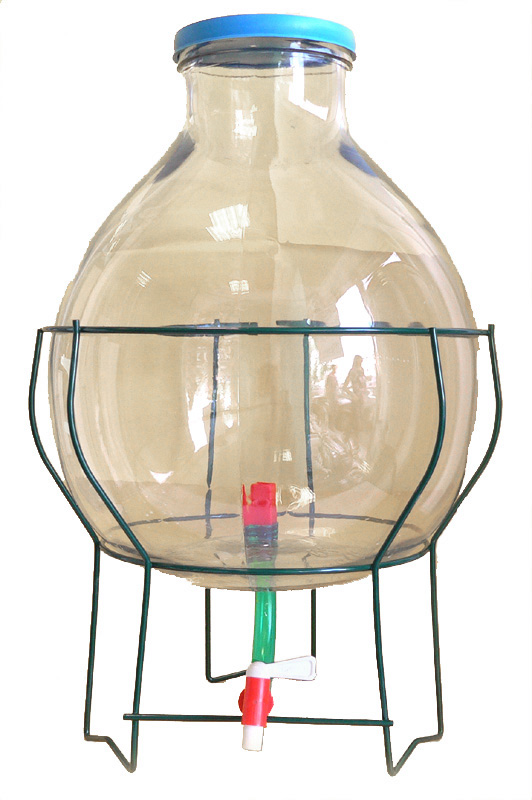 Acetiera in vetro da lt. 20 con rubinetto e supporto metallico.