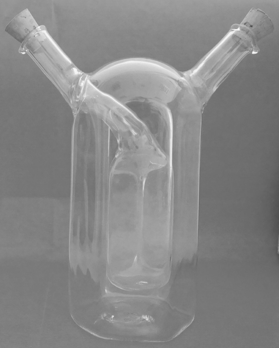 Ampolla per olio e aceto a forma cilindrica esagonale in vetro pyrex soffiato lavorata interamente a mano da abili artigiani.